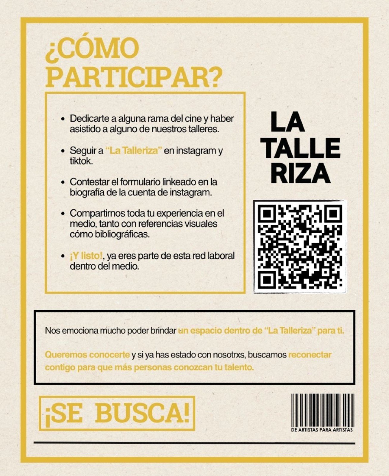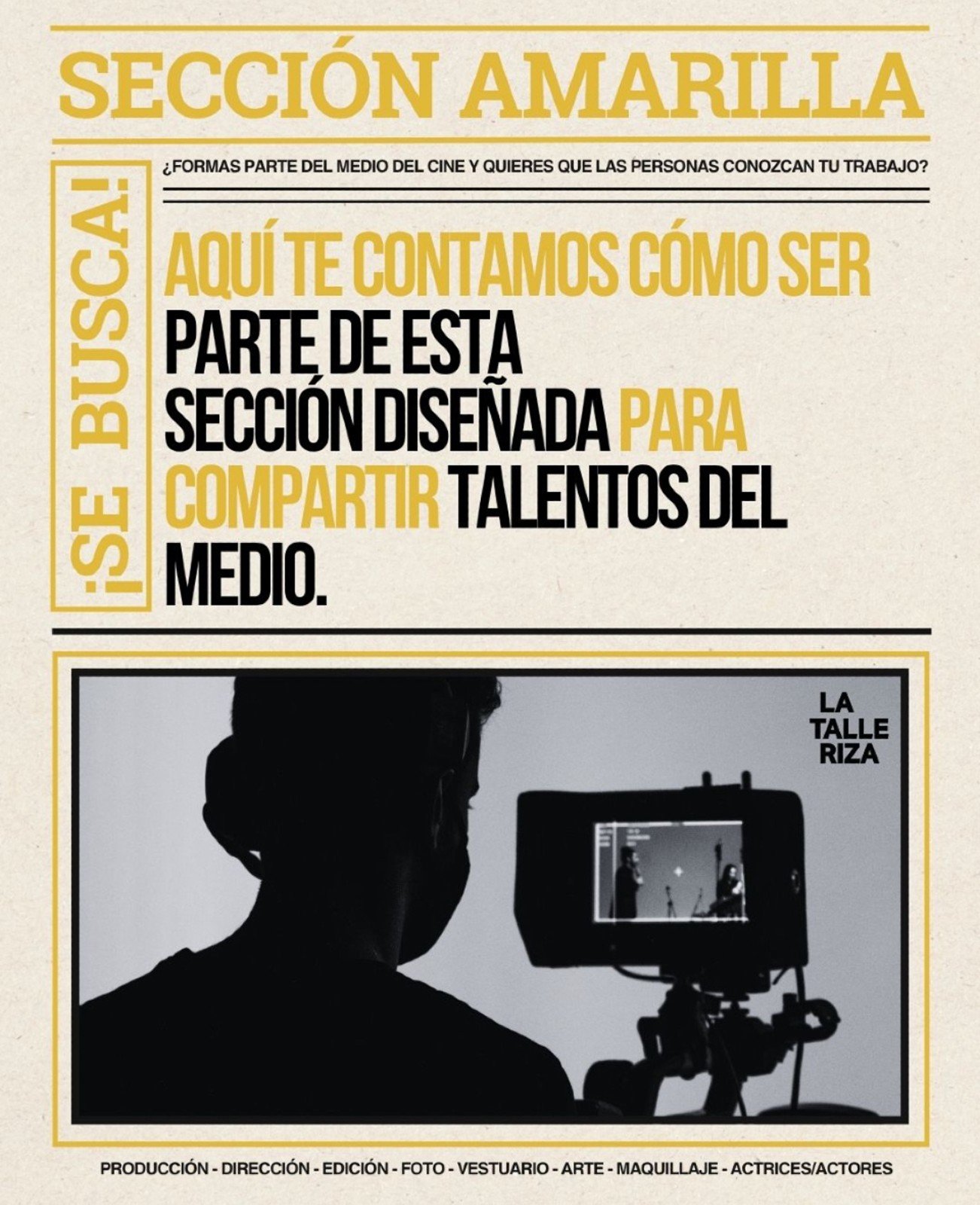 La Sección Amarilla es nuestro directorio exclusivo de alumnos que han formado parte de los talleres y masterclass de La Talleriza. Un espacio diseñado para que la comunidad se mantenga conectada, comparta oportunidades y colabore en nuevos proyectos.